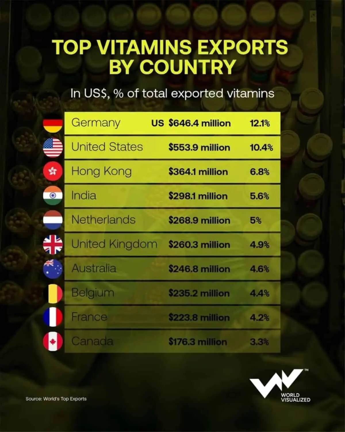 На протяжении последних лет Германия сохраняет позицию абсолютного лидера в экспорте витаминов, ежегодно поставляя за рубеж продукции на сумму более 646 миллионов долларов, что формирует 12,1% всего мирового экспорта. Высочайшее качество, безупречная репутация немецкой индустрии и солидные инвестиции в инновации и современные технологии фармацевтики позволяют Германии сохранять мировое первенство.